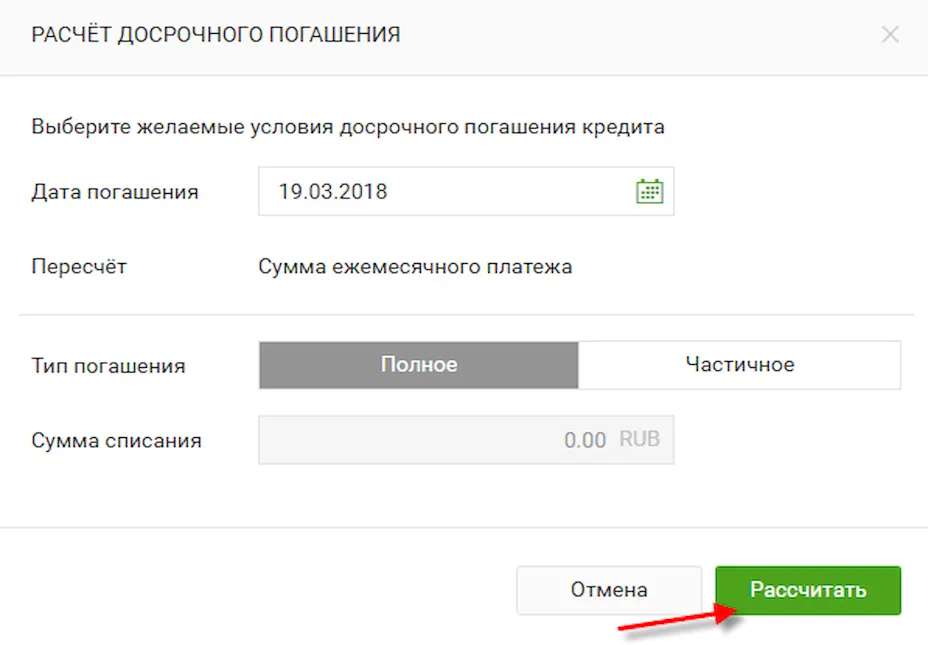 В открывшемся окне выберите счет списания и введите сумму досрочного погашения.