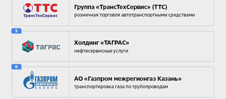 Для исследования были отобраны 50 наиболее крупных компаний Татарстана из разных сфер – это нефтедобыча и нефтепереработка, машиностроение, энергетика, химическая промышленность, агропромышленность, информационные технологии и т.д. В исследовании участвовали такие компании, как Татнефть, Газпром, Транснефть, КАМАЗ, Кориб, Татэнергосбыт, Таттелеком, БАРС Груп, Татпроф, Казаньоргсинтез и другие.